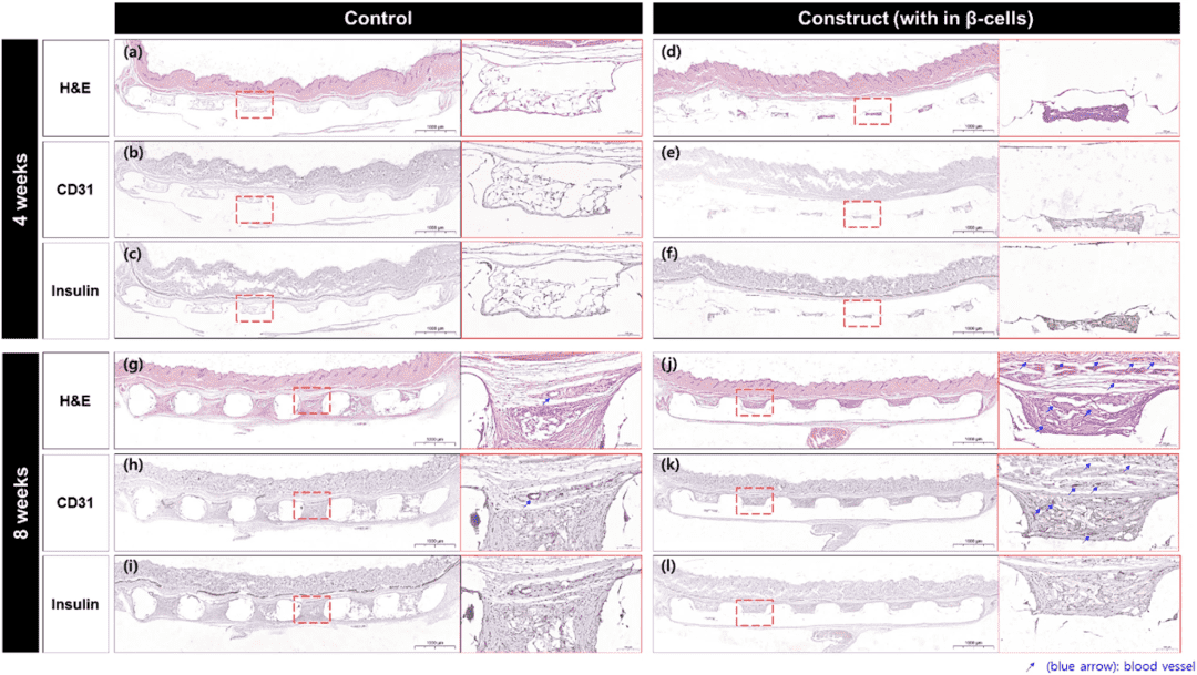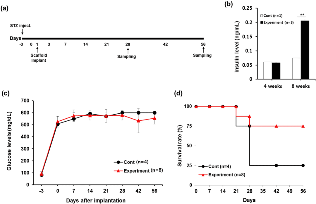 生物打印的MIN-6細胞會聚集成為直徑為100-200 μm的簇,類似于所打印結(jié)構(gòu)的原始胰島。本研究采用患有I型糖尿病的小鼠模型進行體內(nèi)研究,植入生物打印結(jié)構(gòu)的動物在術(shù)后8周顯示出胰島素分泌水平提高三倍并可以控制血糖水平。由于植入的生物打印結(jié)構(gòu)對實驗動物的胰島素分泌有積極影響,因此植入組(75%)的存活率是對照組(25%)的三倍。結(jié)果表明,本文所提出的3D生物打印的皮下結(jié)構(gòu)可能是比門靜脈胰島移植的更好替代方案。