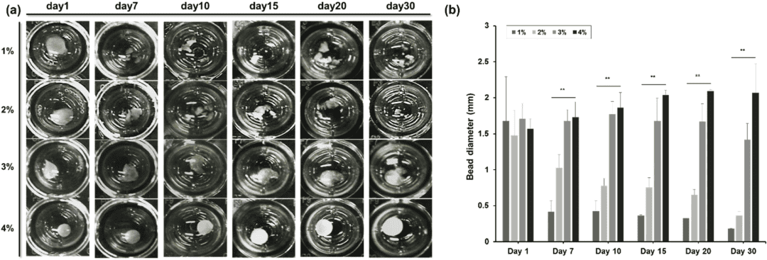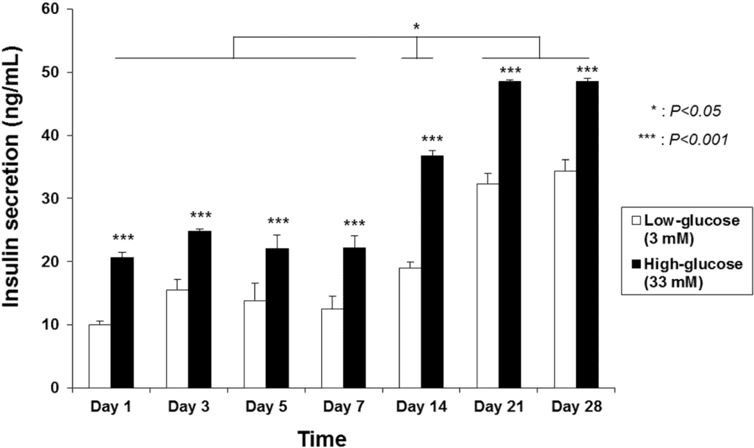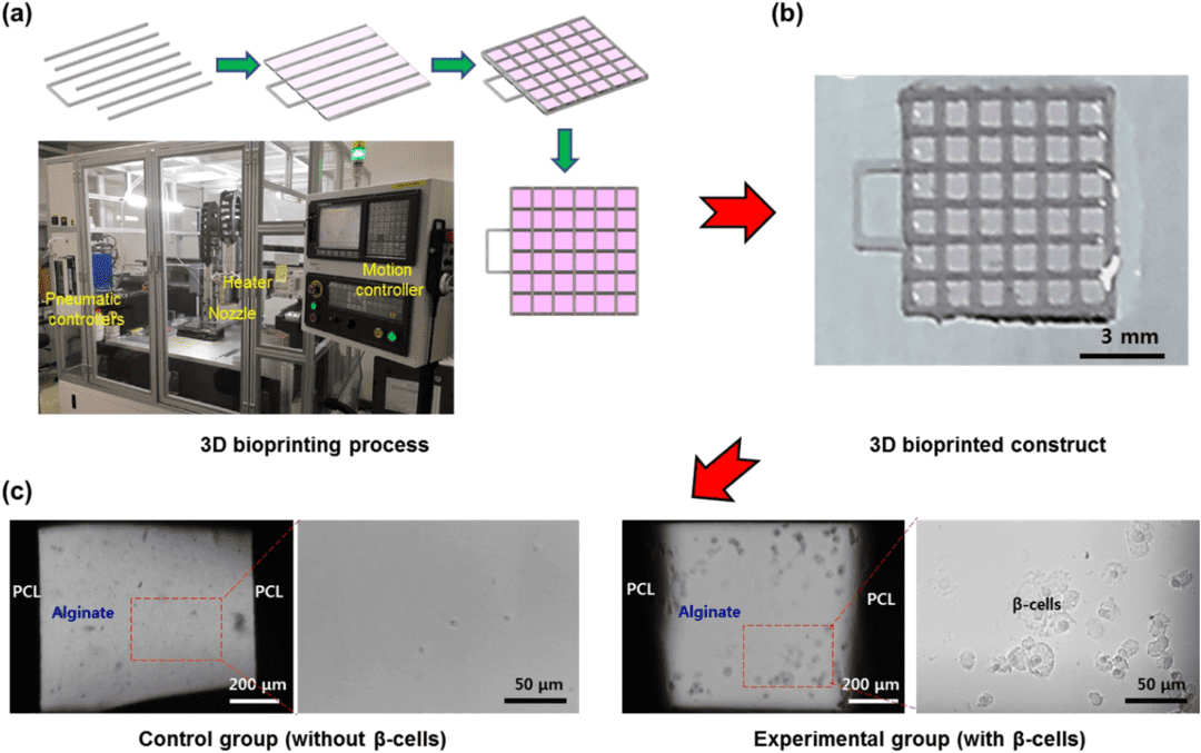 本研究論文聚焦生物3D打印胰島對I型糖尿病的治療研究。I型糖尿病是由朗格漢斯胰島β細胞缺失引起的胰島素缺乏導(dǎo)致的。在嚴重的情況下,一般會將胰島移植到門靜脈中。然而,由于移植胰島的喪失和胰島功能的衰竭,這些患者的5年胰島素獨立率小于50%。在這項研究中,我們開發(fā)了一種長期促進胰島素分泌的3D生物打印結(jié)構(gòu),植入皮下以防止胰島丟失。采用β細胞(小鼠胰島素瘤-6:MIN-6)包封海藻酸鹽生物墨水和聚己內(nèi)酯生物降解聚合物的多層生物打印結(jié)構(gòu)。葡萄糖反應(yīng)測定顯示,該結(jié)構(gòu)在4周的體外培養(yǎng)期間可以正常增殖和釋放胰島素。
