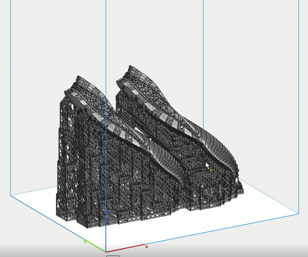 在圖中可以看到,導入Magics平臺中的紋理是二維的圖片。但是實際上黑白的偏移在數(shù)字化咬花模塊中已經以STL+的格式存儲, 加工處理器在切片時會自動處理STL+數(shù)據(jù),基于切片還原帶有咬花的凹凸表面。既保證處理時數(shù)據(jù)量不會過大,同時實現(xiàn)了鞋子以及咬花的順利打印。