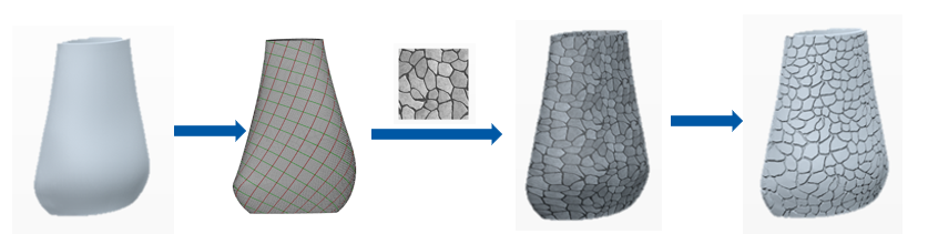 導入到數(shù)字化咬花模塊中的零件都是STL數(shù)據(jù)。當確定好需要貼紋理的表面以后,需要首先在表面上生成UV Map,用來確定將來紋理圖案的大小和方向等。之后就可以將已經準備好的帶有灰度的紋理圖案貼在UV Map上。軟件中根據(jù)設定黑白偏移的參數(shù),直接在零件表面生成帶有凹凸的紋理STL數(shù)據(jù),可以直接用于3D打印。