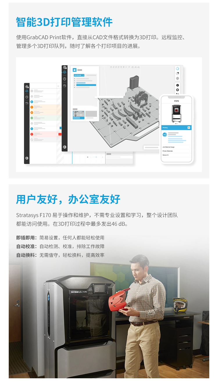 F1233D打印機專為卓越的易用性而設(shè)計,可以精簡工作流程,并能夠與設(shè)計端到打印端的GrabCADPrint“軟件無縫銜接。它們強強聯(lián)合,帶來3D打印平臺優(yōu)化設(shè)計所需的可靠性和簡易性。該打印機的清潔、安靜特性和受認證的安全性確保整個工作流程在辦公空間內(nèi)即可完成。