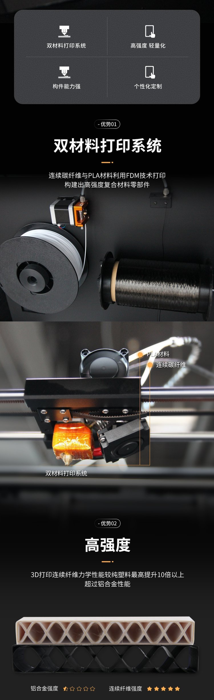 Combot 200連續(xù)碳纖維3D打印機具備雙材料打印系統(tǒng),支持PLA、復(fù)合碳纖維、凱拉夫纖維、玻璃纖維、PEEK等高性能耗材,在打印尺寸成型質(zhì)量方面都有著巨大優(yōu)勢,雙材料打印系統(tǒng)可以最大限度保持構(gòu)件高強度的同時,減輕構(gòu)件重量,為后期材料驗證,板件制作,強度增強,物體減重,科學(xué)研究提供便利。